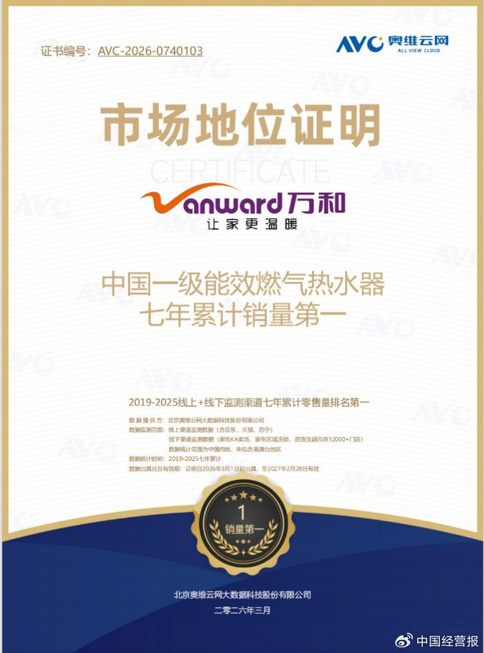 在“双碳”目标持续深化与绿色消费理念日益普及的背景下,中国厨卫电器行业正加速向高效节能方向转型升级。作为燃气热水器领域的节能先行者,万和电气日前荣获奥维云网颁发的“中国一级能效燃气热水器七年累计销量第一”证书。这一荣誉不仅是对万和电气长期坚持技术深耕与产品创新的高度认可,更彰显了其在节能热水器细分赛道的领军地位。